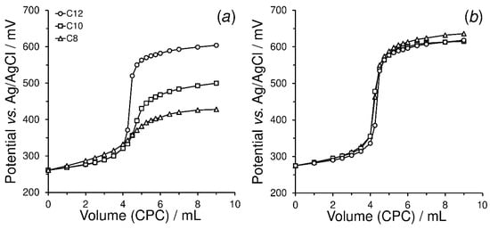 Beyond simple potentiometric acid-base titrations, shungite has not yet been applied in the preparation of special indicators/sensors []. Based on some previous studies and results [,], the use of potentiometric titrations with coated-wire ion-selective electrodes can be taken to represent the first model example of the use of newly proposed shungite-based electrode. The indicatory electrode tested in this work was fabricated by the layering of several PVC membranes onto the BShE surface (ISE-BShE). The PVC-membrane solution was prepared by the mixing of 10 mg of graphite powder (particle size of 5 μm) from Graphite Týn, s.r.o. (Týn nad Vltavou, Czech Republic), 100 mg PVC, 200 μL 2-nitrophenyloctyl ether and 2 mL THF. This procedure was used according to the literature []. Typical titration curves obtained from manual potentiometric titrations of three surfactants differing in the lengths of their alkyl chains (sodium dodecyl sulfate, sodium decyl sulfate and sodium octyl sulfate, all in 0.01 mol L−1) with 0.01 mol L−1 CPC as the titrant are shown in Figure 6a. In addition, the precision of the potentiometric measurements (three representative titrations) is demonstrated in Figure 6b.