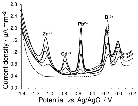 Simultaneous detection of heavy metals using SWASV at BiF-EShE in 0.1 mol L−1 acetate buffer (pH 4.5) containing 0 (dashed line), 10, 20, 30, 40 and 50 µg L−1 Zn2+, Cd2+ and Pb2+, always with 200 µg L−1 Bi3+, Edep = −1.5 V for 120 s, teq = 10 s, Estep = 5 mV, Eampl = 25 mV and f = 25 Hz, simultaneous calibration measurements.