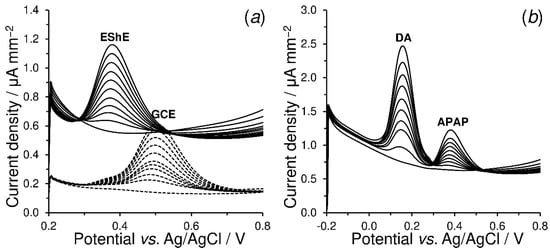 As demonstrated in Figure 8, acetaminophen (APAP), known as an antipyretic and analgetic drug, is electrochemically oxidized to N-acetyl-p-benzoquinone-imine (NAPQI) with the participation of two electrons and two protons [] on EShE at a potential of +0.391 V, compared the higher potential of GCE, of +0.507 V. The width of the corresponding oxidation peaks was comparable for both electrodes. The obtained calibration dependences (j = 0.0061c − 0.0460 with R2 = 0.9989 for EShE and j = 0.0043c − 0.0048 with R2 = 0.9926 for GCE) show a greater sensitivity (k) at EShE. However, due to a higher capacitive current causing a non-negligible intercept (q), the method of standard addition could provide falsely lower results.