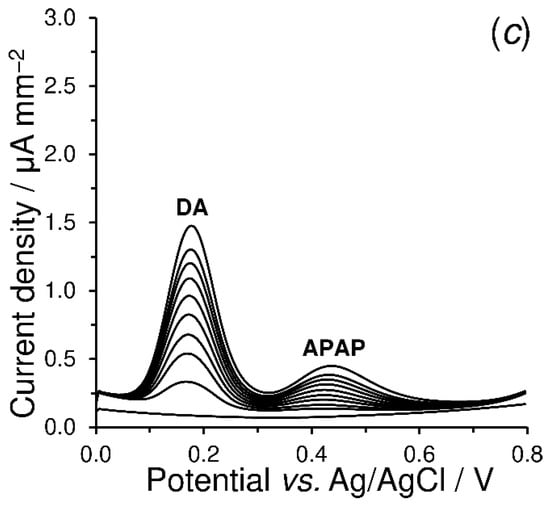 Square-wave voltammograms of 0, 10, 20, 30, 40, 50, 60, 70, 80, 90 and 100 μmol L−1 APAP recorded on EShE and GCE in 0.1 mol L−1 PB of pH 7 at Estep = 5 mV, Eampl = 50 mV and f = 10 Hz (a). Square-wave voltammograms for the simultaneous calibration of DA (0–100 μmol L⁻1) and APAP (0–100 μmol L⁻1) recorded on EShE (b) and GCE (c) under aforementioned working conditions.