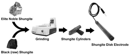 Solid-disk shungite electrodes were manufactured by grinding into the shape of a cylinder (diameter of 3–9 mm and a height of 10 mm) using EcoMet 30 manual grinding and polishing machine from Hanyko Praha s.r.o. (Praha, Czech Republic) at sanding papers WS flex 18 C, self-stick, with silicon carbide of different grit levels (60–320) from Hermes Schleifmittel GmbH (Hamburg, Deutschland). The resulting cylinders were placed into cavity of plastic pipes and electrically connected using metal springs with electric cables, as demonstrated in Scheme 1.