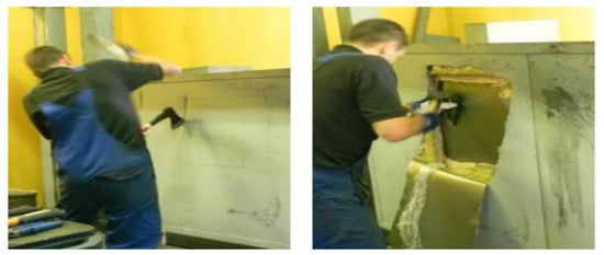 So far, several tests have been carried out to determine the break-through resistance of the security walls. Of note is the test where panel walls 3rd Resistance Class, and 4th Resistance Class were tested, i.e., for Secret and Top Secret, Figure 1. The test methodology was based on EN 1627 and EN 1630. The primary purpose of the test was to create a break-through opening to determine the delay time [17].
