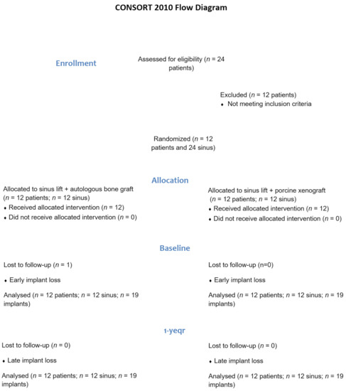 The flow diagram in Figure 1 outlines the entire process concerning enrolment and allocation of patients, as well as the evaluation of the results at the baseline (beginning of the trial) and after one year of follow-up. Overall, 24 patients were invited to be included in the study, but only 12 met the inclusion criteria. Each of the 12 patients included received the sinus lift by xenograft or autologous bone, randomized for each side. A total of 39 implants were placed in augmented maxillary sinuses: 16 implants with 9 mm of length and 23 with 11 mm of length. All implants had a platform of 4.0 mm. However, 38 implants were evaluated since one of the implants (9 mm of length) at the xenograft side did not osseointegrate. There was no need to replace this implant as its absence compromised neither the prosthesis confection nor the patient’s masticatory function. The implant survival rate, after one year of follow-up, was 95% for the xenograft side and 100% for the autologous graft side.