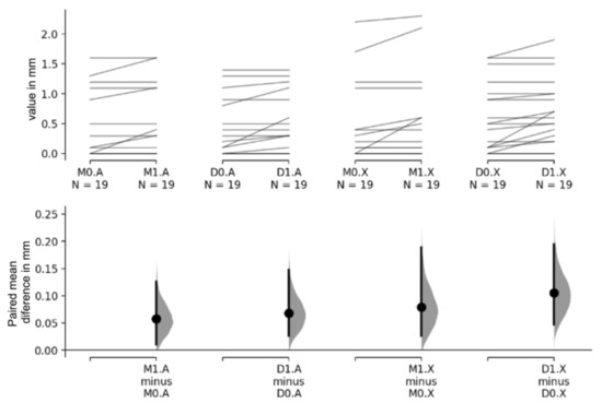 Gardner–Altman plots showing the observed bone loss values for all subjects. The upper axes display the data where each paired set of observations (for the same subject) is connected by a line. In the lower axes, the bootstrapped paired mean difference between the evaluation moments t1 and t0 is plotted as a sampling distribution (grey). Mean differences are depicted as dots and 95% CIs are indicated by the ends of the vertical bars. Legend: M—mesial, D—distal, A—autologous bone graft, X—porcine xenograft, 0—t0, and 1—t1, N—number of implants per group, mm—millimetres.