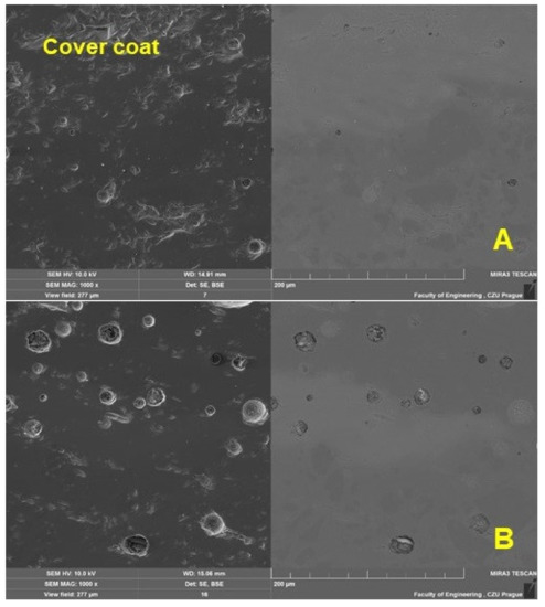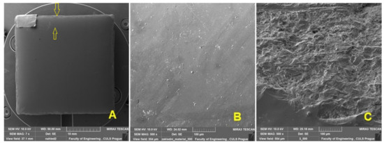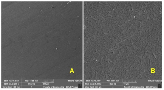 Qualitative parameters were evaluated using SEM (scanning electron microscopy) on a TESCAN MIRA 3 GM (Tescan Brno s.r.o., Brno, Czech Republic) microscope and a Quorum Q150R ES (Tescan Brno s.r.o., Brno, Czech Republic)—Sputtering Deposition Rate using gold. Prepared sections of test samples for testing the quality of inorganic surfaces using SEM analysis were dusted with 5 micrometres of gold. The parameters of the SEM images can be seen from the lower description part of Figures 4–8 at HV 10 kV with the use of SE and BSE detectors.