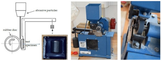 Wear research was carried out in accordance with the Gost standard 23.208-79 [25] (Standard Test Method for Measuring Abrasion Using the Dry Sand/Rubber Wheel Apparatus) on test specimens intended for the abrasive test. It was used for research test equipment Tester T-07, ITC PIB Institution of Technology Radom and the BT-16 Controller (Instytut Technologii Eksploatacji, Radom, Poland).
