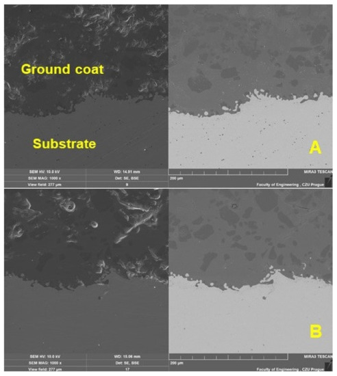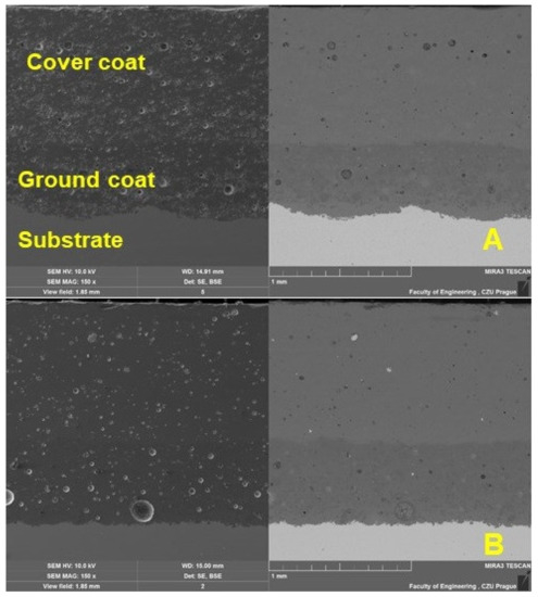 Characterization of the coating was performed using SEM. The results of the SEM analysis shown in Figure 4 show a cross-section of the original and renovated enamel surface characterized by good interaction of the individual layers and significant porosity. The thickness of the ground coat of the original enamel was 482.72 ± 34.35 µm and of the renovated enamel applied by local heating was 577.25 ± 23.40 µm. The thickness of both surfaces differed slightly, by approx. 16%. The thickness of the cover coat of the original enamel was 955.39 ± 14.67 µm and of the renovated enamel applied by local heating was 973.97 ± 13.96 µm. The thickness of both surfaces differed slightly, by approx. 2%.