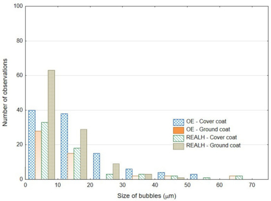 Huynh et al. [8] present in their article findings from optical microscope image analysis. They point out that enamel coatings have bubble structures of different sizes [8]. These bubbles form near the base metal material (substrate) and increase in size towards the top layer. Huynh et al. [8] state that most bubbles are smaller than 15 µm, although some reach 20–40 µm in size and a few reach 50 or 80 µm in size. Huynh et al. [8] further state from the findings of their research that there are also bubbles in the functional covering layer, but they are smaller than in the base layer. The results of the bubbles in the cover coat and ground coat of the original enamel and the renovated enamel applied by local heating can be seen in Figure 5, except for one bubble with a size of 142.43 µm in the ground coat of renovated enamel applied by local heating—REALH, which was outside the measured range. The results of the coats tested by us confirm the results of Huynh et al. [8].