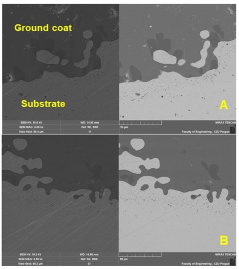Figure 6 and Figure 7 show a detailed view of the transition area, i.e., the interface of the metal material (substrate) and the base enamel surface fused to the metal surface. The pictures show a good interaction between the base metal material and the enamel surface, original and applied during the renovation by local heating. Figure 7 shows a detailed view of the mutual interaction between these surfaces. The ground coat usually has a low viscosity to allow better wetting of the base metal material [8]. It, therefore, aims to connect the basic metal material (substrate) with a functional cover coat. For this reason, the formation of bubbles at the interface between the metal material (substrate) and the base enamel fused to the metal surface should be limited. It is clear from Figure 7A,B that bubbles do not occur directly in the interface area.