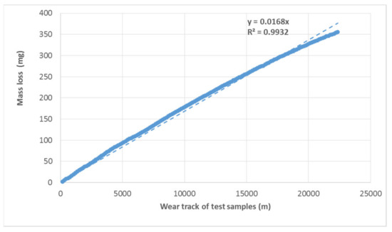 Course of wear of the tested material (mass loss is cumulative depending on the track) under a load of 1600 g.