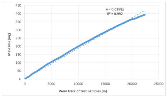 The course of wear shows a linear trend. The results show a linear increase in the mass loss of the tested materials depending on the wear track (Figure 9 and Figure 10). Baptista et al. [26] state that the volume of worn material is increasing slowly but consistently. These conclusions of Baptista et al. [26] are consistent with the research conclusions evident from Figure 9 and Figure 10. Tribological tests show a reduction in wear resistance of approx. 12% on the refurbished enamel surface applied by local heating. The linear trend of increasing mass loss is maintained. Only the direction of the trend given by the functional equation shown in the graph is slightly different. For a proper evaluation, it is also important to determine the determination index R2 by taking a value between 0 and 1. If R2 is equal to or close to 1, a significant correlation exists in this sample. The results show a strong dependence, i.e., there is no difference between the calculation and the actual measured values.