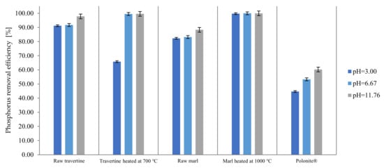 - Gubernat, S.; Masłoń, A.; Czarnota, J.; Koszelnik, P. Phosphorus removal from wastewater using marl and travertine and their thermal modifications. Desalin. Water Treat. 2022, 275, 35–46. [Google Scholar] [CrossRef]