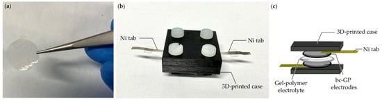The SSC cell was fabricated in a symmetrical configuration, as shown in Figure 1b,c. The 12 mm width disc-shaped PVA-KOH-KCl gel-polymer electrolyte was sandwiched between two 10 mm bc−GP disc-shaped electrodes (Figure 1c). The gel-polymer electrolyte acts both as an electrolyte and a separator. The sandwiched structure was placed in a thick additive-manufactured polymer block and was screwed tightly by Teflon screws (Figure 1b). The SSC cell was allowed to rest for 10 to 12 h before conducting the electrochemical analysis.