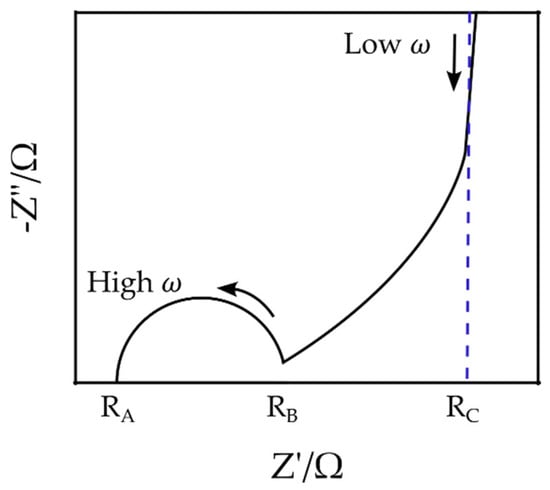 The Nyquist plot of a typical EDLC supercapacitor generally consists of a semi-circle at high frequencies between points and , a nonvertical line at intermediate frequencies between points and , and a nearly vertical line at low frequencies beyond the point [46] (Figure 4). Although EIS can be applied for the characterization and measurement of supercapacitors’ impedance, it can only provide the total impedance, and it is challenging to determine the independent role of each part, e.g., the double-layer and the space charge layer capacitances. Therefore, multiple and often inconsistent physical interpretations of experimental Nyquist plots of EDLCs have been proposed in the literature. The resistance , for example, has been associated with either the bulk electrolyte resistance [47,48,49,50,51,52,53] or the equivalent series resistance (ESR) [54,55,56,57]. Similarly, there are multiple and often contradicting interpretations for other elements, such as the resistance and [51,52,58].