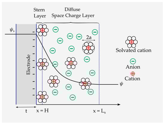 The Stern–Gouy–Chapman model comprises a compact layer and a diffuse space charge layer (Figure 6). In this model, ions are considered to have a finite size and can only approach the electrode surface within the limits of their ionic radii. The Stern layer has a length of . The diffuse space charge layer extends to the length . Moreover, the EDL is formed at a negatively charged electrode by diffusion and adsorption of ions of an effective diameter of . In addition, and are the electrode surface and the electrode/electrolyte interface potentials, respectively. It is also assumed here that the electrolyte thickness is infinite, i.e., . Nonetheless, the closest approach of the ion toward the electrode surface also depends on the solvation of the ion in the solvent because, in this case, the radius of the ion increases (see Figure 6). The plane formed by the centers of the solvated ions is the Stern layer. Solvated ions can interact only with the electrode through long-range electrostatic forces and, hence, are called nonspecifically adsorbed ions. The same double layer forms on the positively charged electrode as well (see Figure 3).