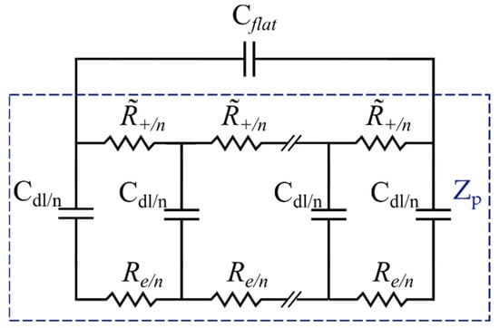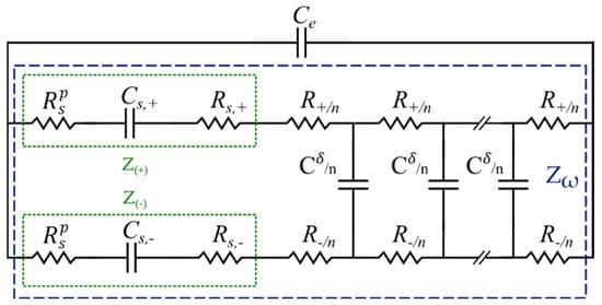 Porous electrodes are usually used in SSCs due to their high specific surface area [65]. Bisquert et al. developed a model for porous electrodes based on the assumption that the electrode material is not ideally conducting compared to the electrolyte [66,67,68]. To simulate the impedance of the pores in an electrode ( a transmission line with two branches (pathways) is used, as shown in the blue rectangle in Figure 7. This configuration assumes ionic conduction by the solution in the pores and electronic conduction in the solids [35]. The two branches are connected with a capacitor, and the circuit is repeated in loops, where is the total number of pores in the system and is defined as , where is the element thickness. Microporous carbon structures with a narrow micropore size distribution are disadvantageous for electrolyte ion diffusion [69]. However, for the sake of simplicity, in this electrode impedance model, it is assumed that ionic species in the pores can be exchanged freely within the bulk solution. Electrons are also assumed to move freely at the substrate interface [35].