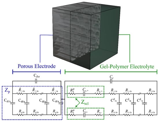 Figure 10 shows the half-cell of a generic SSC with a porous electrode and a gel-polymer electrolyte next to the overall proposed EC model, developed previously using the physicochemical approach. As mentioned earlier, this model is based on the finite electrolyte assumption (). Note that a similar impedance analysis can be applied to the right-hand electrolyte interface if included. The space charge layer impedance is presented in the green box within the gel-polymer electrolyte EC (Figure 10).