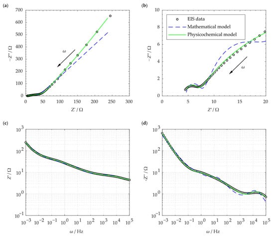 The present study followed two independent approaches to model the impedance response. First, a conventional mathematical model was obtained and used to approximate the measured impedances. Secondly, an advanced physicochemical model was derived and applied to simulate the EIS data. Finally, the best-fit parameters were determined and compared to analytically driven values by fitting these models to the experimental data.