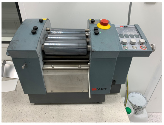 In the next step, the carriers were combined with nanoplatelets of graphene, representing the conductive functional phase. An appropriate amount of graphene and carrier was weighed and ground for at least five minutes in an agate mortar. Each series was prepared in five different degrees of packing of the functional phase (5%, 7.5%, 10%, 12.5% and 15%, respectively. We have prepared pastes with 5–15% packing since pastes with this amount of graphene possess an adequate viscosity for screen-printing technology. Each of the resulting pastes underwent a rolling process using an EXAKT model 80E laboratory three-roll mill (EXAKT Advanced Technologies, Norderstedt, Germany) (Figure 1) with a set gap of 5 µm between the rollers and a torque of 0.2 N/mm.