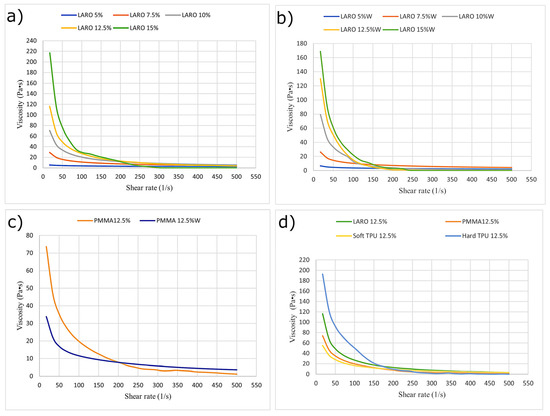 Comparing the results obtained for various carriers, the highest dynamic viscosity was observed for the hard TPU paste (Figure 1d)). Analysing the viscosity dependence on shear rate, one can see that apart from hard TPU, the course for the other three carriers is comparable and the observed values for rates above 100 1/s were not significantly different.