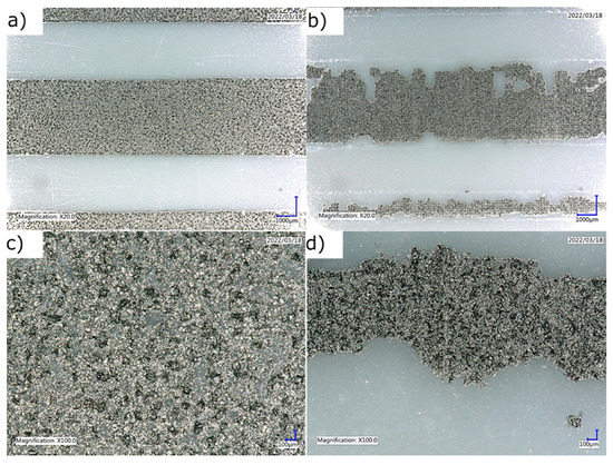 An important parameter that is very often neglected in investigations, but which may vary depending on the packing of the functional phase, and also on the carrier used, is the path thickness. This parameter has great significance in the context of the obtained resistance of the layers. We examined the path thicknesses of all the paths obtained (Table 2). The thickness was measured for four paths of different widths and an average was calculated.