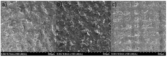 Comparison of SEM images of layers containing 15% packing of graphene based on LARO (a), PMMA (b), and soft TPU (c).