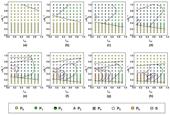 We systemically investigated the patterning of PFNs under the influence of nanoparticle radius Rnp, the fraction fmb of mobile brushes, and the grafting density α. The obtained morphologies were summarized into morphology diagrams to present the role of the nanoparticle radius Rnp, the fraction fmb of mobile brushes, and the grafting density α. Figure 2 shows the morphological diagram in the space of the grafting density α versus the fraction fmb of mobile brushes for nanoparticles with various radii. As shown, only the nanoparticles with fewer patches were observed for small nanoparticles. For example, only the P0 and P1 exist at a radius of 0.4Rg, whereas the P0, P1, and P2 appear at 0.6Rg. One can see that the patchy nanoparticle appears at high grafting density. At small Rnp, the boundary between P0 and patchy nanoparticles shifts towards a low α value as the fmb increases (see Figure 2a–d). Additionally, the number of patches on a nanoparticle decreases with increasing the fmb at a certain α (see Figure 2b–h). For example, at α = 0.4Rg−2 and Rnp = 1.6Rg, a morphology transformation from P6 → P4 → P3 → P2 → P1 appears as fmb increases (see Figure 2g). The striped patterns were observed for the PFNs with a radius larger than 1.0Rg at high α and low fmb (see Figure 2d–h).