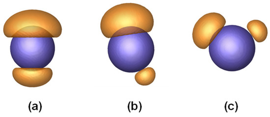We noted in Figure 1 that the patches on a nanoparticle could be different in size. For example, the P3 has three patches with different sizes, and the P5 bears a large patch and four small patches on a nanoparticle. This phenomenon can be referred to as broken symmetry. The broken symmetry includes not only the size asymmetry but also the breaking of spatial symmetry. Figure 5 shows various P2 patterns obtained for the PFN with Rnp = 1.8 Rg and fmb = 0.7. For the P2 obtained at α = 0.2, as shown in Figure 5a, the size of the two patches is different, but their positions are highly symmetric. As the α increases, the positions of the two patches become less symmetric, and spatial symmetry breaking appears (Figure 5b). As α = 0.50, the two patches for P2 are highly asymmetric in space, and the spatial symmetry breaking becomes evident (Figure 5c). The appearance of size asymmetry may be enthalpically favored because forming large domains can reduce unfavorable interactions with solvents. However, this could increase the entropic losses due to the stretching of polymers always from patches. Such chain stretching can be alleviated by changing the position of patches. Consequently, spatial symmetry breaking emerges for some systems.