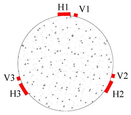Six unidirectional strain gauges were installed at the middle height of each specimen, measuring a length of 50 mm. Three of these strain gauges were used to measure axial strain, and three measured circumferential strain, as shown in Figure 1. The letter H represents the strain gauge used to measure the circumferential deformation of the specimen, and the letter V indicates the axial strain gauge employed to measure the axial deformation of the specimen. All the specimens were tested under concentric compression using a loading machine with a maximum capacity of 3000 kN. Before loading, the end face of the column was polished by an angle grinder so that the axial load could act on the whole section simultaneously. The loading process was controlled by displacement, and the displacement control rate was 0.3 mm/min until the specimen was destroyed.