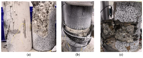 The typical failure modes of the (a) unconfined, (b) two-layer FRP-confined, and (c) three-layer FRiP-confined specimens.