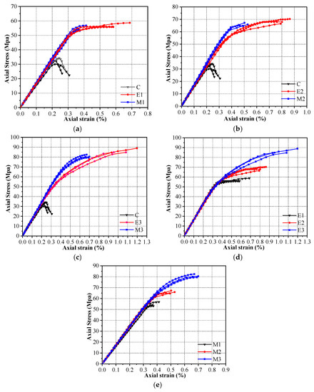 Figure 6 plots the stress–strain curves of the different specimens, representing the relationship between the axial stress and axial strain unless otherwise specified. The axial stress on the specimen is calculated by dividing the axial load by its cross-sectional area. According to the suggestions in some works [58,59], this paper does not use the axial strain data the strain gauges collect. The strain results that the DIC system obtains can often have the same accuracy as those the traditional sensors collect [60,61,62]. Consequently, the axial strain is obtained by dividing the reading of the displacement sensor of the testing machine by the height of each specimen. It was then compared with the strain obtained from the digital image correlation system. The results demonstrate that the two follow the same trend, and the maximum difference in the ultimate strain does not exceed 15%.