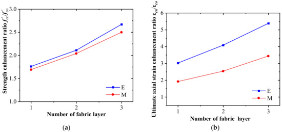 The influence of the number of fabric layers on the (a) strength enhancement rate () and (b) strain enhancement rate (εcu/εco).