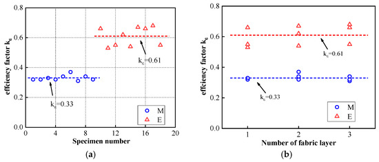 The impacts of (a) the binder type and (b) the number of fabric layers on the strain efficiency factor, kε.