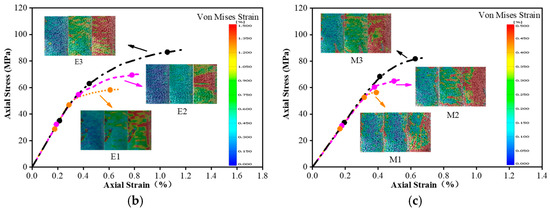 Using the Von Mises strain data obtained from the DIC system, we can realize the strain localization analysis of the unconfined and confined concrete columns; it should be noted that the analysis results ignore the influence of additional confinement at the column end. The Von Mises strain contours at different stages of the sample are associated with the stress–strain curve to determine the Von Mises evolution result, as drawn in Figure 9.