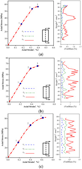 Figure 9a depicts the Von Mises strain evolution of the unconfined concrete. In the elastic stage, the degree of strain localization on the surface of the sample is low, and the strain distribution is relatively uniform. When the load approaches the peak, the degree of strain localization of the specimen increases significantly. As the stress–strain curve enters the descending stage, the strain localization of the specimen further increases with the development of cracks.