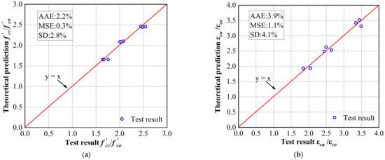 This paper introduces into the expression of the ultimate strength and ultimate strain by referring to Adheem’s modeling method [66], so Equations (1) and (2) change to the following: