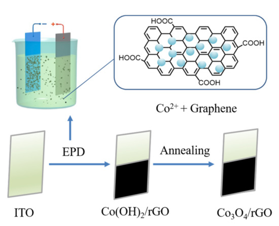 The Co3O4/rGO composites were successfully deposited on the ITO interface via a facile electrophoretic method and subsequent thermal annealing process. As illustrated in Figure 1, positively charged Co2+ with graphene moved towards the cathode with the applied voltage of 50 V as the driving force. At the surface of the ITO, the reduction of NO3− ions occurred and the generated OH− reacted with absorbed Co2+, forming Co(OH)2 on the graphene sheets. The coating scheme is as follows [25,26]: