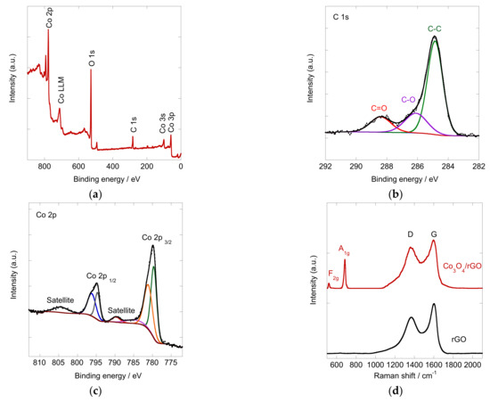 High-resolution XPS of the Co3O4/rGO composite: (a) full spectrum; (b) C1s and (c) Co 2p spectrum and (d) Raman spectra of Co3O4/rGO (red) and rGO (black).