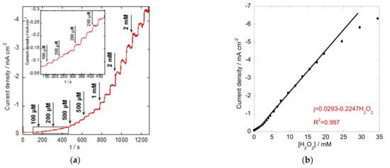 The amperometric current–time response of the Co3O4/rGO-modified electrode was further investigated with continuous injections of different concentrations of H2O2 into stirred PBS buffer at an applied potential of −0.60 V. As presented in Figure 6a, a staircase response was achieved with increasing concentration of added H2O2. The current density increased sharply and reached a stable value with a quick response within 6 s. Responses to lower additions are zoomed in as the inset in Figure 6a. In addition, the corresponding calibration curve was acquired by plotting the obtained peak current density against the H2O2 concentration in Figure 6b. A good linear relationship was obtained from 0.1 to 19.5 mM, with a regression equation as follows: j (mA cm−2) =0.0293–0.2247[H2O2] (mM), R2 = 0.997. An estimated sensitivity of 0.2247 mA mM−1 cm−2 and a detection limit of 10 µM (signal-to-noise ratio (S/N) = 3) were achieved using the Co3O4/rGO composite-modified electrode. The sensing performance of the proposed electrode showed a comparable wide linear range and high sensitivity to the previously reported H2O2 sensors based on Co or the carbon-related nanostructures listed in Table 1.