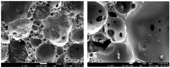 Foam glass granule inner structure microstructure analysis results: zoom in 100 times (left) and 500 times (right).