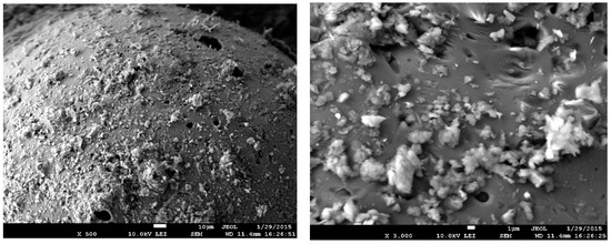 Foam glass granule surface microstructure analysis results: zoom in 500 times (left) and 3000 times (right).