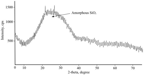 Two fraction white-foam glass granules (Ltd. “Stikloporas” Druskininkai, Lithuania) were used, 0.1/0.25 and 0.25/0.5. Granules were produced from clear window glass shards by melting them at a high temperature (around 850 °C) in a rotary kiln. Glass shards are crushed into powder and mixed with foamers in drum mixers. Afterwards, formed granules are heated in rotary kilns, separating them with a separating medium—metakaolin. After heating various diameters, granules are obtained which conform to LST EN 13055-1:2003 standard requirements. Foam glass granule properties are shown in Table 4. A foam glass granule-enlarged image is shown in Figure 1, granule-inside image is shown in Figure 2, the microstructure of a granule-surface image is shown in Figure 3, while X-ray analysis results are shown in Figure 4. Foam glass granules are covered with a melted cover, which has a low amount of open pores (Figure 2). Such foam glass granules are covered with small metakaolin particles. These metakaolin particles have a positive influence on Portland cement hydration and hardening [19,20]. Inside foam glass, granules have many pores and gaps; between coarse pores smaller ones are spread out, and between those ones even smaller pores (Figure 3). In analyzing research results (Figure 4), it can be noted that granules form an amorphous material, from which small cristobalite peaks can be observed.