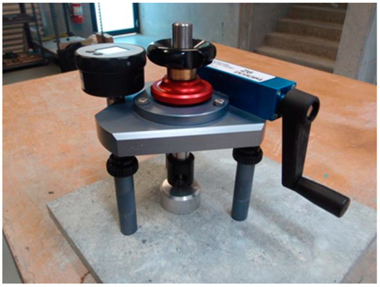 Hardened-tile-glue tensile-adhesive strength was determined according to LST EN 12004-2:2017. Sample machine was adjusted to tensile strength force experiment (Figure 5). The machine pulled a pulling tile with a 250 ± 50 N/s load using adapted and bending strength and not creating part.