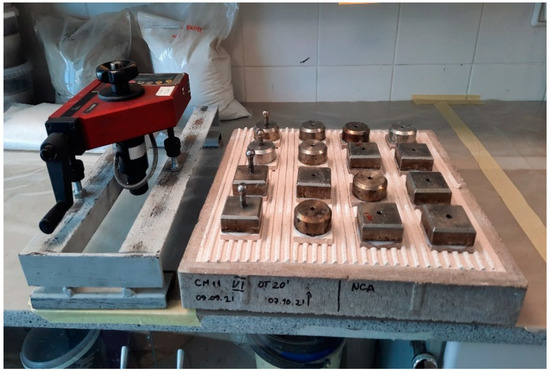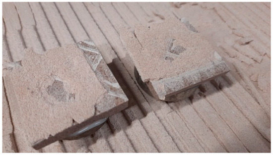 Dry pressing ceramic tiles that fulfill LST EN 14411 B I group requirements were used to determine glue tensile-adhesion strength. They are of very low porosity, and their water absorption is ≤0.5% according to mass. They are unglazed, smooth, have a matte gluing surface and have (50 ± 1) mm × (50 ± 1) mm measurements. For the hardened-gluing-mixture tensile-adhesion strength experiment, used samples are shown in Figure 6.