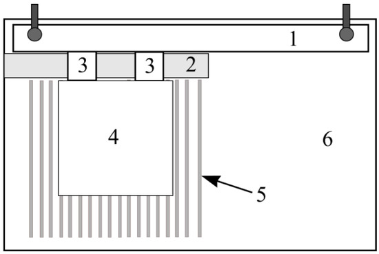 Slip experiment scheme: 1—steel verification ruler; 2—25 mm width cover line; 3—25 mm × 25 mm size 10 mm width spacers; 4—ceramic tile 100 mm × 100 mm; 5—glue; 6—concrete plate.