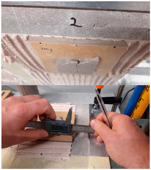 The slip test was performed according to LST EN 12004-2:2017. The tile slip test was performed on freshly applied tiles. Steel verification ruler was secured onto the upper part of the concrete tiles with clamps in such a way that the verification ruler’s lower side would be horizontal when the tile is set into a vertical position. A 25 mm wide cover line without any gaps was added at the bottom under the steel verification ruler, while the concrete tile was applied with a thin layer of prepared glue layer in a square using a trowel. Then, on the concrete tile surface, the thinner glue layer was applied in such a way that it slightly covered the lower cover line’s edge. Glue was applied at a vertical angle with a jagged trowel into the verification ruler.