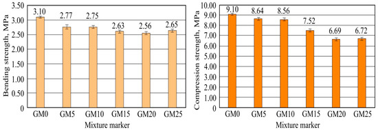 After a 28-day hardening, sample bending and compression strength was determined. Strength averages are shown in Figure 11.
