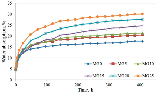 The foam glass-granule filler amount has a considerable effect on long-term absorption results. From Figure 15, it can be seen that MG5 and MG10 batch sample absorption was the lowest from those mixtures, which have foam glass granules. In lowering the sample density, the sample absorption rises. The highest absorption was after 17 days—30.1% was obtained with the highest foam glass granule amount of MG25. In the short period, from second to twelfth hour of soaking time, MG15 and MG20 batch sample initial absorption was lower than other batches with lower granule amounts. Fastest and firstly, water fills coarse pores, and later, over a longer time, fills smaller pores and foam glass granules. This can be seen when comparing absorption from one-hour absorption and absorption after 17 days. With regards to long-term absorption, it can be noted that hardened-glue mixture water fills gradually, while constant absorption is reached after a long time period, in this case 17 days. The difference between the benchmark sample batch (MG0) and the sixth sample batch (MG25) absorption after an hour was 19%, and after 17 days this difference reached 70%.
