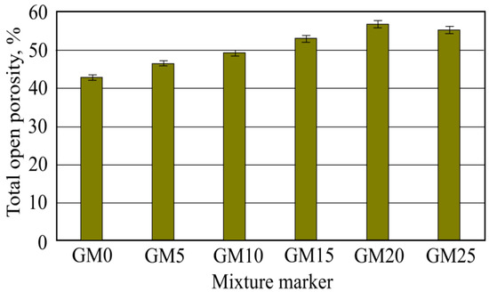 According to water absorption after vacuum results, the total open porosity was calculated. From Figure 17, it can be seen that the sample batch with the lowest porosity was in first benchmark batch samples without foam glass granule additive. The highest porosity was obtained with GM20 batch samples, which used 20% granule amount. The sixth batch-obtained porosity was lower. The higher the open porosity value, the higher the chance that resistance to frost for this material will be higher [23]. In other research work, it was noted that materials produced using glass have great bonding properties with hardened cement rock, which is a high resistance to frost indicator [24]. In other research work, it was investigated that 50–60% total open porosity was enough for resistance to a rise in frost value [25].