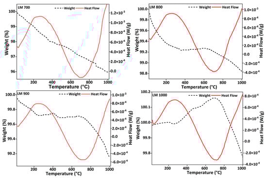 Thermogravimetric profiles of LM 700, LM 800, LM 900, and LM 1000.